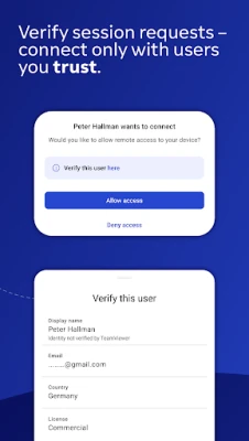 Connect only with users you trust. The app will provide you with user details, such as name, email, country, and license type, so you can verify the identity before granting access to your device.